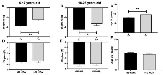 When it comes to the baseline refractive error and lifestyle habits reported in the questionnaires for the children group, it was −3.7 D/year in the <10 h/OA group and −3.6 D/year in the >10 h/OA group (a non-significant difference of −0.1 D/year, p > 0.05) (Figure 3D). Similarly, in the group of young adults, it was −4.1 D/year in the <10 h/OA group and −4 D/year in the >10 h/OA group (a non-significant difference of −0.1 D/year, p > 0.05) (Figure 3E). There were no significant differences in the group of middle-aged adults (p > 0.05).