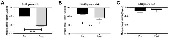 Rate of myopia progression (diopters/year) pre- and post-PC. (A): Children aged 6–17 years. (B): Young adults aged 18–25 years. (C): Middle-aged adults >40 years. PC: pandemic confinement. Significance p < 0.05. ** p < 0.01, **** p < 0.0001.