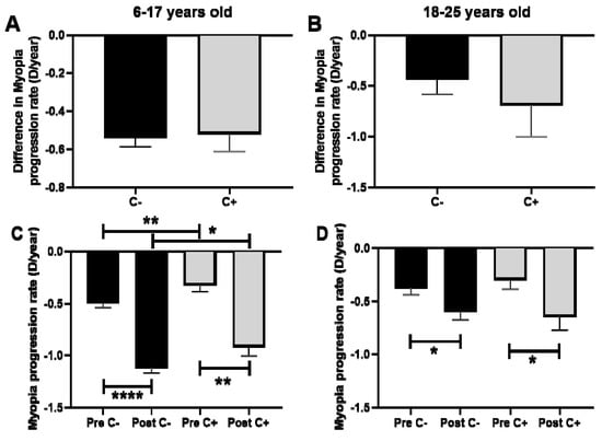 (A,B): Comparison of the difference in the rate of myopia progression after PC regarding the presence or absence of CUVAF. (A): Children aged 6–17 years. (B): Young adults aged 18–25 years. (C,D): Comparison of the myopia progression rate (D/year) in pre- and post-PC in relation to the presence of CUVAF. (C): children aged 6–17 years. (D): young adults aged 18–25 years. C: CUVAF (conjunctival ultraviolet autofluorescence). PC: pandemic confinement. Significance p < 0.05. * p < 0.05, ** p < 0.01, **** p < 0.0001.