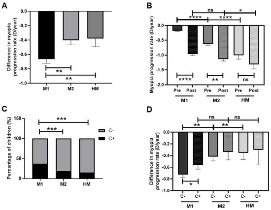 The greatest difference in myopia progression rate after PC was seen in the M1 group (−0.7 D/year gain), followed by the M2 group (−0.4 D/year gain) and the HM group (−0.3 D/year gain) (p < 0.01, Figure 6A). When the pre-PC myopia progression rate was analyzed, a great difference between the three groups was observed (p < 0.0001), with M1 showing the lowest rate of pre-PC progression and HM the highest. However, in the post-PC progression rate analysis, these differences disappeared between M1 and M2 (p > 0.05) and were less notable between M1 and HM (p < 0.05; Figure 6B).