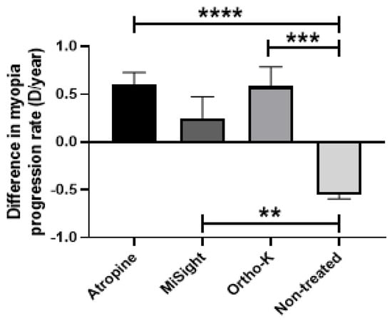 Differences in myopia progression rates after COVID-19 confinement regarding different types of myopia treatments in children. Atropine drops; MiSight®, and Ortho-K contact lenses. Significance p < 0.05. ** p < 0.01, *** p < 0.001, **** p < 0.0001.
