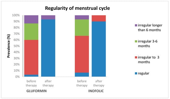 Figure 2. The regularity of the menstrual cycle in patients before and after treatment with gluformin or Inofolic R.