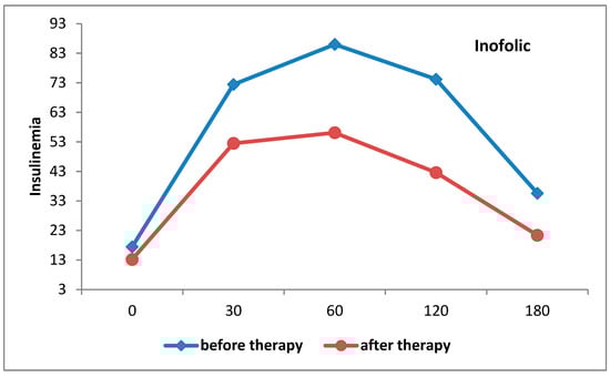 Figure 3. Insulinemia curves in patients treated with Inofolic R before and after therapy.