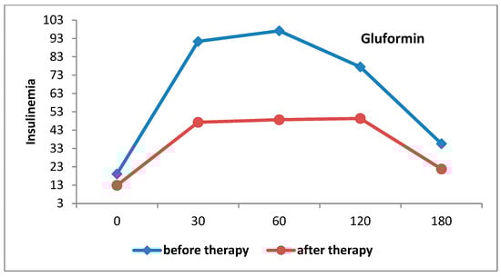 There was a statistically significant decrease in the AUC of insulinaemia in the group that received gluformin (F = 56.247; p < 0.001) (Figure 4).