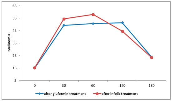 Figure 5. Insulinemia curves after therapy with gluformin or Inofolic R.