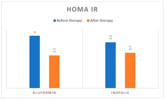We also observed a statistically significant decrease in HOMA IR after either i = Inofolic R or gluformintherapy (F = 17,013; p < 0.001) (Figure 6).