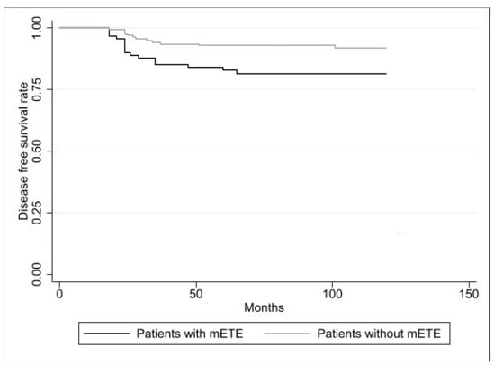 Moreover, patients with mETE had a significantly shorter DFS after ten years than those who did not have mETE. Additionally, patients with mETE experienced a faster occurrence of metastases than those without mETE. However, the difference in median values between both groups was not statistically significant.