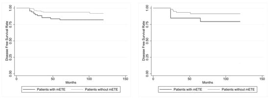 Evaluating the disease-free survival (DFS) after ten years, this was significantly lower in the patients with mETE with respect to the patients without mETE (82% vs. 92%, p = 0.0059), as reported in Figure 1.