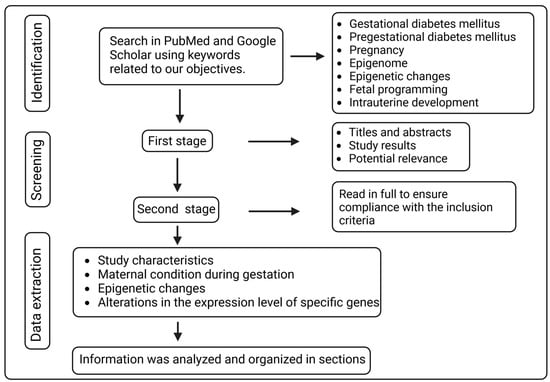 Articles considered for inclusion in this review had to meet the following criteria: a focus on the effects of diabetic pregnancies and other maternal conditions related to the epigenome, publications in peer-reviewed scientific journals, original studies, systematic reviews, meta-analyses, and clinical guidelines, with priority given to publications within the past five years to ensure contemporary relevance. The selection of articles was conducted in two stages. In the first stage, one of the researchers (M.L.A.) reviewed titles and abstracts, which were blinded regarding authorship, authors’ affiliations, and study results, to determine their potential relevance. In the second stage, preselected articles were read in full to ensure compliance with the inclusion criteria and to extract relevant information.