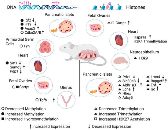 Effect of diabetes during gestation on the epigenome of exposed animal models. Epigenetic changes on DNA (left) or histones (right) in specific genes caused by diabetes during gestation. The scheme shows the type of epigenetic alteration found in cells, tissues, or organs, in addition to the change in the expression level of each gene. Igf2: insulin-like growth factor 2. H19: imprinted maternally expressed transcript. Agap2: ArfGAP with GTPase domain, ankyrin repeat, and PH domain 2. Cdkn2A/B: cyclin-dependent kinase inhibitor 2A/B. Fyn: Fyn proto-oncogene. Sirt1: sirtuin 1. Sumo3: small ubiquitin-like modifier 3. Pdp1: pyruvate dehydrogenase phosphatase catalytic subunit 1. Cartpt: cocaine- and amphetamine-regulated transcript Cart prepropeptide. Tgfb1: transforming growth factor beta 1. Hspa1a: heat shock protein 1A. Pdx1: pancreatic and duodenal homeobox. Slc30a8: solute carrier family 30 (zinc transporter), member 8. Aldh1a3: aldehyde dehydrogenase family 1, subfamily A3. Ldha: lactate dehydrogenase A. Hhex: hematopoietically expressed homeobox. Adcy5: adenylate cyclase 5. Lmo4: LIM domain only 4. Rapgef5: Rap guanine nucleotide exchange factor 5. Ehf: ETS homologous factor. Gc: vitamin D-binding protein.