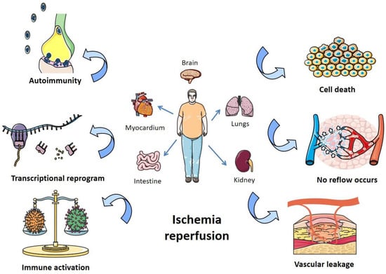 Ischemia-reperfusion (I/R) injury is a pathological process that can occur in many organs of the human body, accompanied by severe cell damage and inflammatory reactions [1]. In recent years, it has become one of the most common causes of disability and death worldwide [2]. There is a lot of evidence that tissue damage is caused not by ischemia itself, but by the sudden resumption of blood supply after a period of ischemia [3]. Organ ischemia-reperfusion injury often occurs in traumatic shock, surgery, organ transplantation, burns, and other blood circulation disorders [4]. The main organs involved in vascular reperfusion injury are the heart, brain, liver, and kidney, and it can also induce systemic inflammation and eventually lead to multiple organ failure [5]. However, not all organs with ischemia will have I/R injury after blood flow recovery, and many factors can affect its occurrence and severity. For example, if the ischemia time is short, or collateral circulation is easy to form after ischemia, there may be no significant reperfusion injury after the restoration of blood supply. Because oxygen readily accepts electrons and forms oxygen free radicals, organs with a high oxygen demand are more prone to reperfusion injury [6]. In addition, appropriately reducing the temperature and pH value of the perfusion solution and reducing the content of Ca2+ and Na+ in the perfusion solution are conducive to alleviating the reperfusion injury [7]. The pathogenesis of organ I/R injury is summarized in Figure 1.