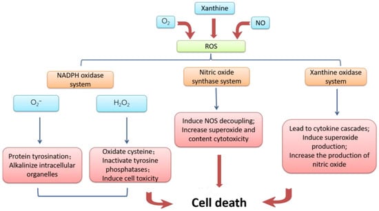 Mechanism of cell damage induced by reactive oxygen species. Excessive accumulation of reactive oxygen caused by I/R and conversion to NADPH oxidase, nitric oxide synthase inhibitor, and xanthine oxidase resulting in cell apoptosis.