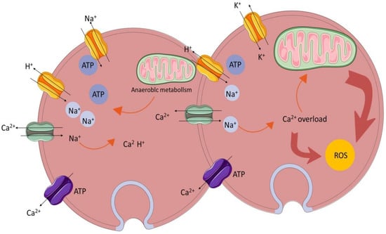 The homeostasis and regulation of the calcium ion concentration in and outside cells are important conditions for maintaining cell function [11]. Calcium overload is the phenomenon of an abnormal intracellular calcium ion concentration leading to structural damage and dysfunction in the functional metabolism [12]. The mechanism of calcium overload is summarized in Figure 3. When I/R injury occurs, the local intracellular calcium ion concentration increases significantly, resulting in the disturbance of calcium ion homeostasis and an insufficient mitochondrial oxidation capacity [13], thus activating phospholipase to damage other organelles or activating calcium-dependent protease activity, as well as increasing the production of oxygen free radicals [14].