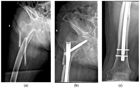 An 84-year-old patient diagnosed with a subtrochanteric fracture after a fall from the same height treated with CRIF with long Gamma Nail fixation: (a) preoperative radiograph; (b,c) postoperative radiographs.