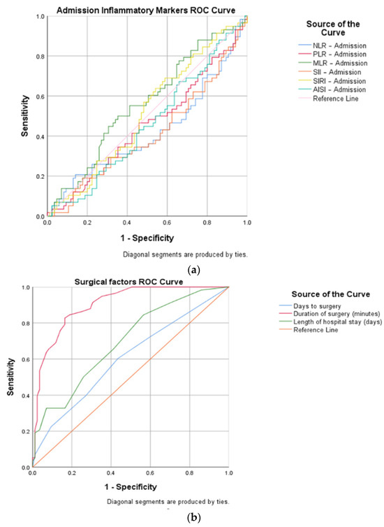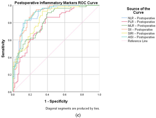 AUC (area under the curve), sensitivity, and specificity (Figure 3) demonstrated a high diagnostic ability of the following variables: postoperative NLR (cut-off 6.95, AUC 0.026, sensitivity 94.8%, specificity 70.6%), postoperative PLR (cut-off 186.13, AUC 0.039, sensitivity 79.3%, specificity 65.9%), postoperative MLR (cut-off 0.66, AUC 0.034, sensitivity 89.7%, specificity 61.2%), postoperative SII (cut-off 1970.47, AUC 0.026, sensitivity 86.2%, specificity 81.2%), postoperative SIRI (cut-off 167.54, AUC 0.032, sensitivity 87.9%, specificity 68.2%), postoperative AISI (cut-off 1857.45, AUC 0.025, sensitivity 82.8%, specificity 85.9%), days to surgery (cut-off 2, AUC 0.049, sensitivity 60.3%, specificity 56.5%), duration of surgery (cut-off 58, AUC 0.025, sensitivity 82.8%, specificity 83.5%), and LOHS (cut-off 8, AUC 0.044, sensitivity 65.5%, specificity 58.8%).