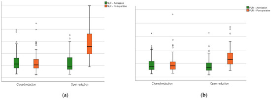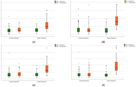 In relation to the preoperative phase, the hematologic-derived indexes (NLR, MLR, PLR, SII, SIRI, and AISI) had a significant growth after surgery in the open reduction group (Figure 4).