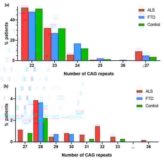 A total of 757 patients (620 ALS and 137 FTD patients) and 362 controls were included in this study. Their demographic, clinical and genetic characteristics are summarized in Table 1. In the ALS patients, the CAG repeat expansion size ranged from 22 to 36 repeats, in the FTD patients, it ranged from 22 to 30 repeats, and in the controls, it ranged from 22 to 33 repeats. Regarding allele frequencies, in the ALS patients, the most common allele was (CAG)22 (52.1%), followed by (CAG)23 (32.1%). The most frequent alleles in the FTD patients were (CAG)22 (48.2%) and (CAG)23 (27.0%). Finally, the predominant allele among the control group was also (CAG)22 (51.1%), followed by (CAG)23 (31.8%) (Figure 1).
