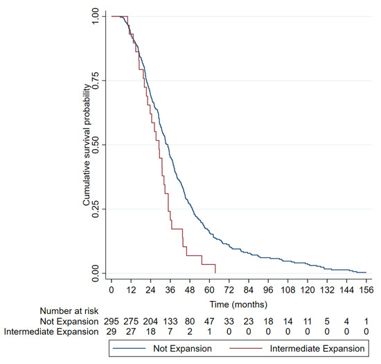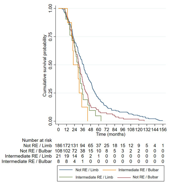 The longest survival was observed in the group of patients with limb onset who were non-carriers of an intermediate ATXN2 expansion (red), followed by the group with bulbar onset who were non-carriers of an intermediate expansion (blue). Among the intermediate-expansion-carrying groups (≥27 CAG repeats), patients with bulbar onset (green) also exhibited shorter survival.