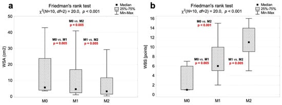 Results of planimetric and clinical evaluation. (a) WSA results before (M0) and after ESW intervention (M1, M2). (b) WBS results before (M0) and after ESW intervention (M1, M2). Abbreviations: WSA, wound surface area; WBS, wound med score, M0, measurement at baseline; M1, measurement after first ESW intervention; M2, measurement after second ESW intervention; M0–M1, comparison between M0 and M1; M0–M1, comparison between M0 and M2; M1–M2, comparison between M1 and M2.