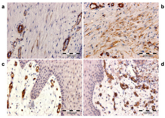 It should be noted that the cells with the fusiform shape typical of fibroblastic cells were subjected to immunocytochemical evaluation. Nevertheless, in the dermis area at the edge of the wound, lymphocytic infiltrates and proliferating endothelial cells may also show positive reactions to the proliferative antigen, making it difficult to assess the number of studied cells accurately [22]. Therefore, the study evaluated the myofibroblasts of wounds and their microvasculature. Fibroblasts in granular tissue differentiate into myofibroblasts by organizing the contractile apparatus in a process dependent on the interaction between cells and the extracellular matrix (ECM), growth factors, and mechanosensory signals [23,24,25]. The primary sources of wounded myofibroblasts are local fibroblasts in the intact dermis and subcutaneous tissue [26]. The increase in myofibroblasts in mice wounds usually begins on day 3 and peaks on day 7 after wounding [27].