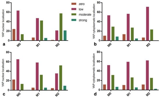 An immunocytochemical evaluation of YAP1 protein expression was performed for ten patients with PUs (10 independent measurements for each tissue section). The presence of YAP1 was demonstrated in the nuclear and cytoplasmic localization both in the epidermis and dermis. For the area of the wound edge before ESW intervention (M0), the YAP1 protein was localized mainly in the basal layer of the epidermis in the nuclear and cytoplasmic localization (Figure 2a). The YAP1 antigen expression in keratinocyte nuclei before the ESW intervention (M0) was distributed with the following values: no expression, 24; low expression, 63; moderate expression, 13; and strong expression, 0 (Figure 3a). After the ESW intervention (M1), YAP expression in the nuclei of keratinocytes was visible both in the basal cell and lower layer of spinal cells (Figure 2b). The distribution of YAP1 expression values in keratinocyte nuclei was as follows: no expression, 6; low expression, 47; moderate, 42; and strong, 5. After the second ESW intervention (M2), YAP expression in keratinocyte nuclei was as follows: no expression, 1; weak expression, 21; moderate expression, 57; and strong, 21 (Figure 3b). Before the ESW intervention (M0), the values of YAP expression in the cytoplasm of keratinocytes were distributed as follows: none, 10; weak, 53; moderate, 29; and strong, 8 (Figure 3c). After the first ESW intervention (M1), the distribution of YAP protein expression values was as follows: no response in cytoplasm, 13; weak response, 56; moderate one, 27; and strong one, 4. After the second ESW intervention (M2), the values of the YAP protein expression were distributed in the following manner: no reaction, 6; weak reaction, 71; moderate reaction, 23; and strong reaction, 0. The distribution of YAP protein expression values at nuclear and cytoplasmic locations in keratinocytes is presented in Figure 2c. The analysis showed that the differences in YAP expression in keratinocyte nuclei (χ2 = 103.5, p < 0.0001) and the cytoplasm (χ2 = 14.36, p = 0.0259) were significant. YAP1 protein in dermis cells was localized in fibroblasts/myofibroblasts and vascular endothelial cells. The immunocytochemical evaluation revealed the antigen in both the cytoplasm and nucleus (Figure 2). Before the intervention of ESW (M0), the reaction intensity in the cell nuclei was distributed with the following values: no reaction, 22; weak reaction, 65; moderate reaction, 13; and strong reaction, 0. However, after the first ESW intervention (M1), the subsequent distribution of the reactions was obtained: no reaction, 5; weak reaction, 58; moderate reaction, 32; and strong reaction, 5. After the second ESW intervention (M2), the distribution of the reaction values was as follows: no response, 4; weak response, 35; moderate response, 52; and strong response 9. The distribution of values shown in Figure 3c was statistically significant (χ2 = 61.4, p < 0.0001). Before the ESW intervention (M0), the cytoplasmic responses to the YAP antigen in the dermis were distributed as follows: no reaction, 11; weak reaction, 52; moderate reaction, 31; and strong reaction 6. After the first intervention of ESW (M1), the distribution of reactions was as follows: no reaction, 10; poor reaction, 59; moderate reaction, 26; and strong reaction, 5. After the second ESW intervention (M2), the distribution of the intensity of immunocytochemical reactions to the YAP1 antigen was distributed with the following values: no reaction, 11; weak reaction, 62; moderate reaction, 25; and strong reaction, 2 (Figure 3d). The analysis of the cross-tabulation with the χ2 test indicated no significant results (χ2 = 3.732, p = 0.7129) (Table 2).