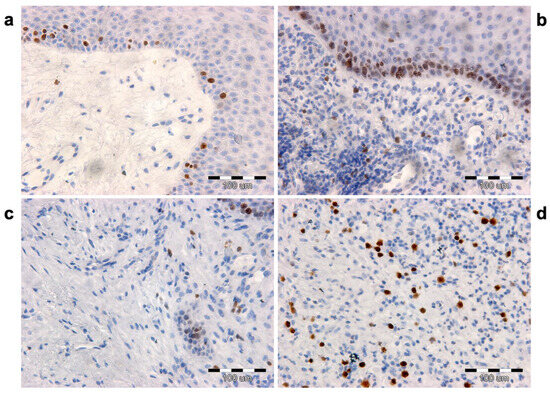 Proliferation index by detection of the Ki-67 antigen. (a) Before ESW (M0) intervention, only single basal layer keratinocytes are immuno-positive. (b) After ESW (M2) intervention, the number of proliferating keratinocytes in the basal layer increases significantly, and few cells are visible in the spinous layer. (c) Localization of Ki-67 antigen in skin connective tissue prior to ESW intervention (M0). (d) After ESW (M2) intervention, there is a significant increase in proliferating cells.