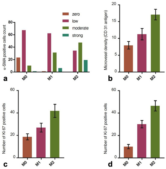 Distribution of alpha smooth muscle actin, micro-vessel density (CD31), and Ki-67 (proliferation index). (a) Distribution of smooth muscles’ alpha actin expression values (α-SMA) in miofibroblasts before and after ESW intervention. (b) Microvascular density before (M0) and after ESW intervention (M1, M2). (c) Proliferation index (Ki-67 antigen) before and after ESW intervention in the epidermis. (d) Proliferation index (Ki-67 antigen) before and after ESW intervention in the papillary layer of the dermis. Abbreviations: α-SMA, smooth muscle alpha-actin; CD31, cluster of differentiation 31; Ki-67, proliferation marker; M0, measurement at baseline; M1, measurement after first ESW intervention; M2, measurement after second ESW intervention.
