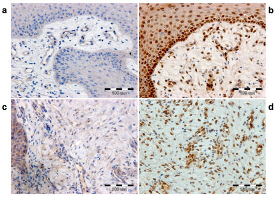 Immunocytochemical localization of the YAP protein. (a) Photo of a fragment of the skin before ESW intervention (M0); There is no reaction in the keratinocytes, while the reaction with a cytoplasmic localization is visible in the endothelium of the blood vessels of the papillary layer of the dermis. (b) YAP protein expression after ESW (M2) intervention is evident in the nuclear localization in the basal layer and in the spinous layer cells. (c) Localization of the YAP protein in the dermis before the intervention (M0). There is a weak reaction in the cytoplasm of fibroblasts and endothelial cells of blood vessels. (d) YAP protein localization after shock wave intervention. A strong reaction is localized in the cell nuclei of fibroblasts and in the nuclei of vascular endothelial cells.