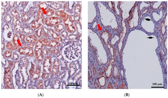 Immunohistochemical staining of renal cortex was performed in 12-week-old wild-type (A) and PKD/Mhm (Cy/+) (B) rats for Anks6. Anks6 localized in the brush border of proximal tubules (red arrow). Cysts came mainly from proximal tubules, but there were also cysts without anks6 expression (arrowhead) (unpublished results, the Anti-Anks6 sc-515124 Ab Santa Cruz Biotechnology, was used in a 1:150 dilution; scale bar 100 μm).
