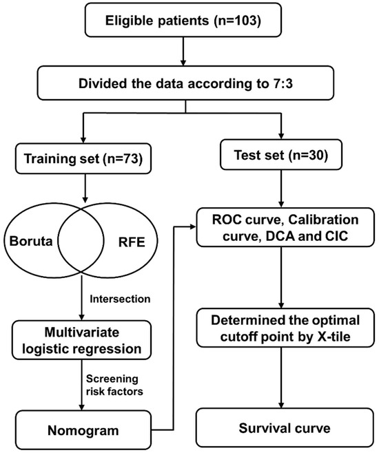 A total of 103 patients who had developed PCP following kidney transplantation at the Organ Transplantation Department of Renmin Hospital of Wuhan University between 2018 and 2023 were encompassed in this study. The inclusion criteria were as follows: (1) Metagenomic next-generation sequencing (mNGS) was employed to ascertain the existence of Pneumocystis by detecting microbial pathogens in the sputum or peripheral blood of kidney transplant recipients; (2) The maintenance of immunosuppressive agents, comprising mycophenolate mofetil + tacrolimus/cyclosporine + glucocorticoids. Patients were excluded if they met any of the subsequent criteria: (1) Had undergone relative kidney transplantation; (2) Had undergone multiple kidney transplantations or combined transplantations; (3) Possessed incomplete clinical data. The flow chart of the research design is shown in Figure 1. The study received approval from the Ethics Committee of Renmin Hospital of Wuhan University. We categorized PCP cases requiring admission to the intensive care unit (ICU) for treatment as severe PCP.