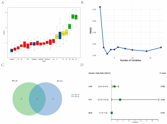 The variables were screened using machine learning and multi-factor logistic regression. (A) Boruta method filters variables; (B) RFE method to filter variables; (C) Venn diagram with the intersection of two machine learning methods; (D) Multivariate logistic regression screening variables. RFE: recursive feature elimination.
