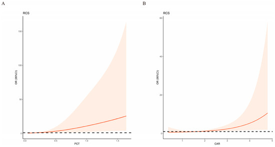 (A) The association between PCT and ICU was shown using RCS; (B) the association between CAR and ICU was shown using RCS. RCS: restricted cubic splines; PCT: procalcitonin; CAR: c-reactive protein/albumin ratio; ICU: intensive care unit.