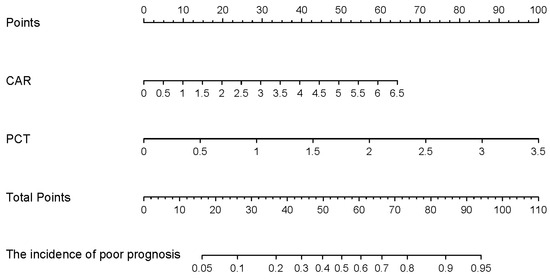 In this study, we developed an interpretable nomogram utilizing machine learning and multivariate logistic regression to predict the prognosis of renal transplant-related PCP. By combining CAR and PCT, we established a prediction model that outperforms reliance on a single clinical indicator. This model achieved prediction probabilities of 0.861 and 0.896 in the training group and the test group, respectively. Additionally, our redefined scoring system, based on the two indicators with a cutoff value of 59.5, effectively stratified the risk of prognosis related to PCP after kidney transplantation. It not only identifies the risk of severe PCP but also predicts the risk of in-hospital mortality. Clinicians can easily obtain the patient’s total score by mapping the CAR and PCT values from the nomogram’s first row and summing them up. Patients with scores exceeding 59.5 are classified into the high-risk group. Identifying patients prone to severe disease allows for targeted interventions such as enhanced nutritional support, adequate supplementation of human blood albumin, and intensified respiratory support like high-flow oxygen administration. Moreover, escalated doses of co-trimoxazole and caspofungin are administered, while hormone doses are adjusted appropriately. If the patient’s financial condition permits, he or she can be transferred to the ICU as soon as possible for individual care and better respiratory support. Therefore, the predictive model, based on direct blood testing indicators, has the potential to provide valuable assistance to clinicians in the early detection of severe cases. However, it is important to note that this study was conducted at a single center and involved a relatively small sample size. To enhance the robustness and generalizability of these findings, future endeavors should consider conducting multi-center studies with an extended follow-up period.