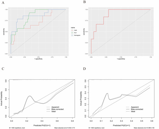 The two selected variables from the multivariate logistic regression model were utilized to refit the model, yielding the following predictive equation: Y = −4.1763 + 2.1636 × X1 + 0.7481 × X2, where X1 corresponds to PCT, and X2 pertains to CAR. The equation p = 1/(1 + exp(−Y)) was then employed to calculate the predictive value of the model for each patient. A direct association of PCT and CAR values to the points in the first row, as depicted in Figure 4, was used. These values were combined via addition to yield the total score. As illustrated in Figure 5A, the area under the ROC curve for the model in the training group was 0.861. Notably, the AUC of the model surpassed that of both PCT (AUC = 0.847) and CAR (AUC = 0.723). When compared to a solitary independent predictor, the nomogram exhibited superior predictive capability regarding the probability of renal transplant-related PCP necessitating ICU admission. The Hosmer–Lemeshow p-value for the training group was 0.741, indicating a well-fitting model. Additionally, we conducted external validation using data from the test group, yielding an area under the ROC curve of 0.896, as depicted in Figure 5B. Calibration curves derived from 1000 bootstrap samples demonstrated satisfactory calibration for both the model training group and the validation group, with Brier scores of 0.095 and 0.102, respectively (Figure 5C,D). To assess the clinical utility of the prognostic model, we applied DCA and plotted CIC, both of which showcased favorable performance across the threshold probability range (Figure 6A,B).