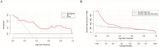 DCA and CIC curves were used to evaluate the clinical efficacy of the nomogram. (A) DCA curve. (B) CIC curve. DCA, decision curve analysis; CIC, clinical impact curve.