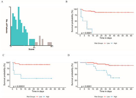 We calculated and synthesized the total scores for all patients using the nomogram and then employed X-Tile software to categorize patients into two risk groups: low risk (total score < 59.5) and high risk (total score ≥ 59.5), as illustrated in Figure 7A. In both the training and validation cohorts, the Kaplan–Meier curves clearly demonstrated the efficacy of the new risk stratification system in distinguishing between the risk of ICU admission (Figure 7B,C). Furthermore, across the entire patient population, the Kaplan–Meier curve effectively stratified patients based on their risk of mortality (Figure 7D). Consequently, the new nomogram could be used to risk stratify patient outcomes.