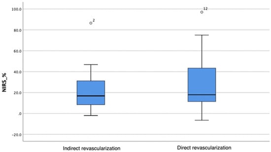 Oxygenation changes in the indirect and direct angiosomal revascularization groups. The horizontal bar represents the median value, while the blue box spans the interquartile range (IQR), representing the 25th to 75th percentiles. Whiskers represent minimum and maximum values. Outliers are represented separately as number 2 and number 12.