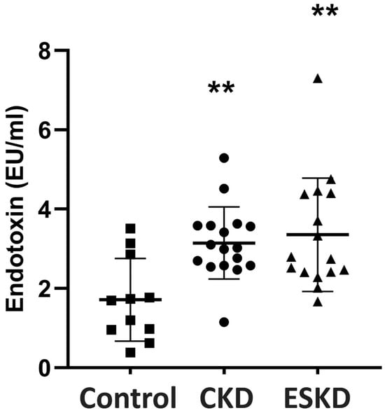 Endotoxin concentrations in the peripheral blood of CKD patients and controls. Statistical analysis was performed with nonparametric analysis of variance (Kruskal–Wallis test) followed by a post hoc Mann–Whitney U test with Bonferroni correction. CKD: chronic kidney disease; ESKD: end stage kidney disease. ** p < 0.01 vs. controls.