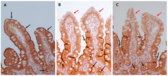 Representative photomicrographs of occludin immunohistochemical expression in the duodenal mucosa: in controls (A), almost all of the epithelial cells lining villi and crypts exhibit positive cytoplasmic and apical membranous immunostaining for occludin (black arrows). In patients with CKD (B) and ESKD (C), there is a pronounced depletion of cytoplasmic immunostaining for occludin and loss of apical membranous expression in numerous epithelial cells, mainly at the upper part of the villi (red arrows), while expression is generally preserved in crypts (black arrows) (all microphotographs ×200).