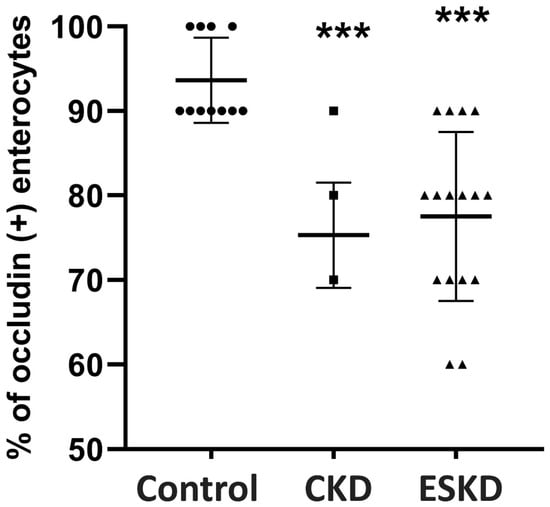 Occludin expression (% of occludin (+) enterocytes) in the intestinal mucosa of controls and CKD patients. Statistical analysis was performed with nonparametric analysis of variance (Kruskal–Wallis test) followed by a post hoc Mann–Whitney U test with Bonferroni correction. CKD: chronic kidney disease: ESKD: end stage kidney disease. *** p < 0.001 vs. controls.
