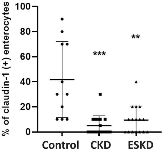Claudin-1 expression (% of claudin-1 (+) enterocytes) in the intestinal mucosa. Statistical analysis was performed with nonparametric analysis of variance (Kruskal–Wallis test) followed by a post hoc Mann–Whitney U test with Bonferroni correction. CKD: chronic kidney disease; ESKD: end stage kidney disease. ** p < 0.01, *** p < 0.001 vs. controls.