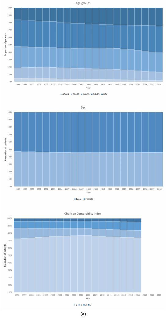 Study population characteristics from 1998, 2008, and 2018 can be seen in Table 2, displayed as absolute numbers and frequencies. The development of these characteristics for each year from 1998 to 2018 is shown in Figure 1a,b. Data for each year in the study period can be seen in File S1, Table S2.