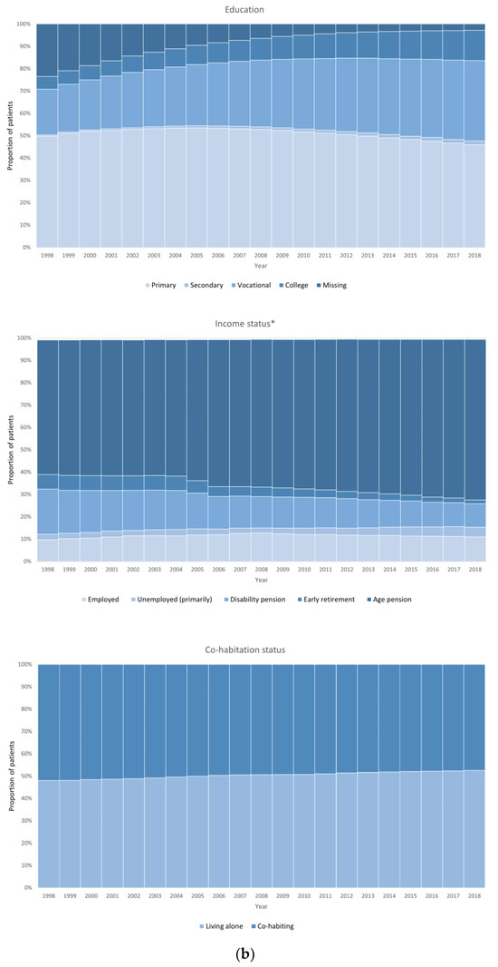 (a) Annual study population characteristics (age groups, sex, and comorbidities). (b) Annual study population characteristics (co-habitation status, education, and income status). * “Education” and “other” constitute < 1% each year.