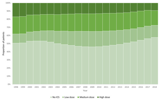 Annual proportion of patients in treatment with ICS (including dose) from 1998 to 2018.