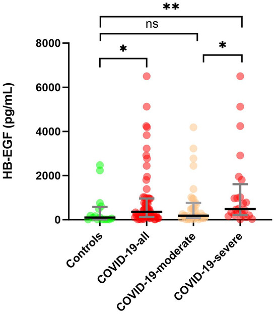 Scatter dot plot with median (IQR) representation of HB-EGF plasma (pg/mL) concentrations in the four cohorts (Controls, COVID-19-all, COVID-19-moderate, and COVID-19-severe). Stars represent the level of significance between the groups: * < 0.05, ** < 0.01; ns—not significant.