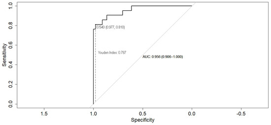The prediction model was developed through multivariate logistic regression analysis; the results were summarized in Table 3. In the prediction model, delta miR-195 (p = 0.0005) and HB-EGF (p = 0.0374) remained the only significant independent parameters. The Hosmer–Lemeshow goodness-of-fit test has a high p-value (0.9697), indicating a very good logistic regression model fit. As shown in Figure 3, the receiver operating characteristic (ROC) curve of the model had an excellent area under curve (AUC) of 0.9556, with p-value less than 0.0001, a negative predictive power of 89.47%, and a positive predictive power of 91.30%. The calculated Youden Index for the ROC curve was 0.787 (at a sensitivity of 0.810 and a specificity of 0.977).