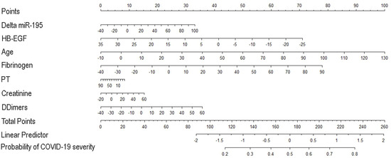We used univariate descriptive analysis to select (p < 0.05) the potential risk biomarkers suitable for inclusion in the multivariate logistic model for prediction of COVID-19 severity. HB-EGF (p = 0.0371), delta miR-195 (p < 0.0001), PT (p = 0.0088), fibrinogen (p = 0.0094), D-Dimers (p = 0.0242), creatinine (p = 0.0269) were all significantly increased in the COVID-19 severe group. Since the risk of COVID-19 severity increases due to the isolated effect of increasing age by year [18], we also included age (p = 0.0043) in our risk prediction model.