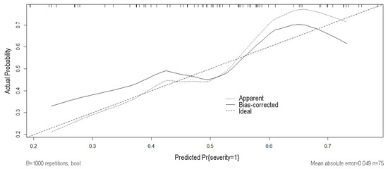 Based on the abovementioned variables of the prediction model, we constructed a nomogram for assessing the clinical outcome of the disease (Figure 4), in which each parameter was assigned a point according to each patient’s molecular signature, and the total points corresponded to the patient severity probability. Age resulted in having the most significant regression coefficient, and its range corresponded vertically to the point range 0–100 of the point scale. The proposed nomogram presented a Harell’s C-index of 0.8137 with a 95% CI of 0.7211 to 0.9063, indicating the model had a good predictive ability.