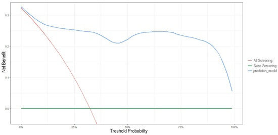 We performed a decision curve analysis to determine whether the benefits of a clinical decision based on the risk prediction model outweigh the disadvantages. The clinical utility of the prediction model is represented by the net benefit illustrated in the graph through the blue line. In our risk prediction model, the net clinical benefit resulted in values over 0.05 and the highest AUC across a wide range of threshold probabilities, from 0.01% to approximately 100%. Therefore, screening COVID-19 patients based on our proposed prediction model would lead to a higher clinical net benefit than all-screening and non-screening strategies. Using this prediction model to determine whether the patients are at high risk of developing a severe form of COVID-19 disease would improve clinical management and might prevent a severe outcome for these patients (Figure 6).
