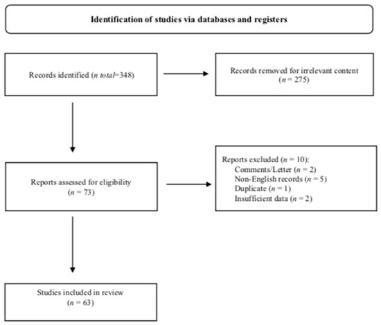 From a search of the literature with the aforementioned search strategy on PubMed, 348 records were identified. We excluded 275 records for irrelevant content after they were screened by two authors independently. Of the remaining 73 potentially eligible studies, one duplicate, one comment, one letter to the Editor, two with insufficient information, and five in a non-English language were excluded (Figure 1).
